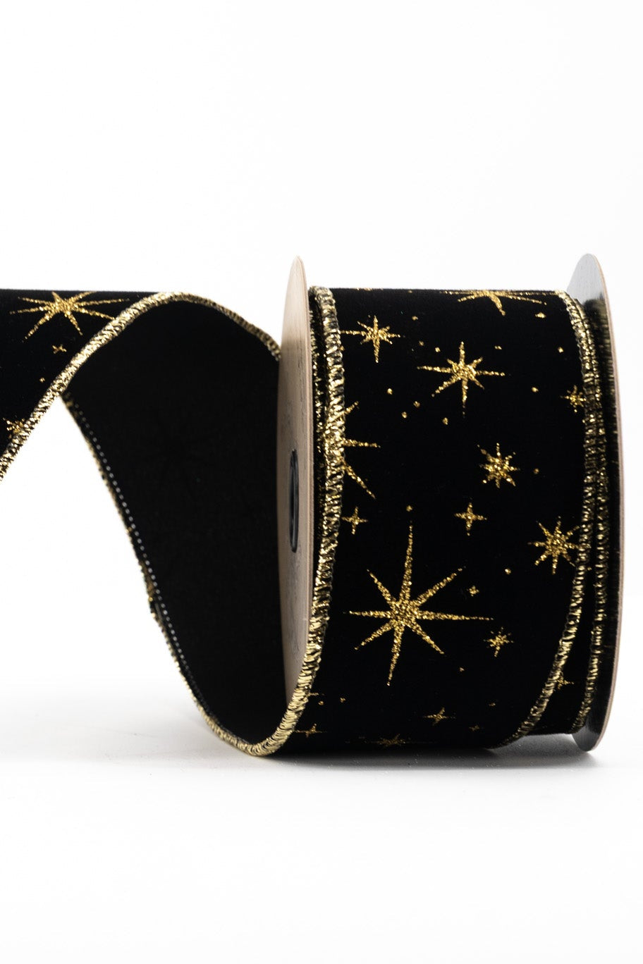 Bring a touch of celestial elegance to your holiday décor with our Black Starry Night Ribbon. Featuring a soft fabric base in deep black, this ribbon is adorned with shimmering gold stars that catch the light beautifully. Its wired edges make shaping effortless, whether you're creating bows, trimming garlands, or elevating your gift wrap. A stunning, versatile accent for any luxe or modern holiday theme.