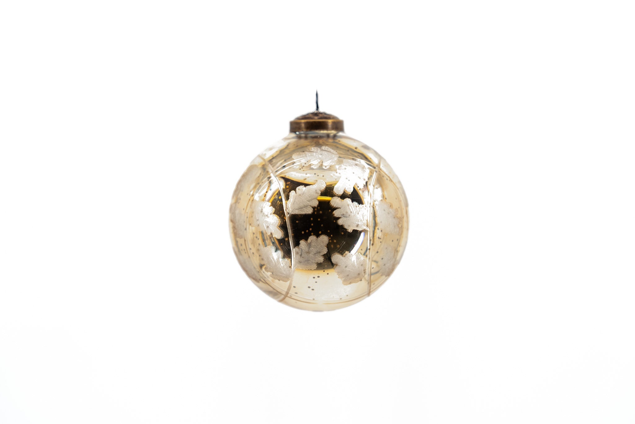 Capture the timeless beauty of nature with our Bronzed Oak Leaf Ornament, a stunning accent crafted from mercury glass that glows with vintage charm. Each ornament features delicate etched oak leaves, accented by a soft bronzed finish that reflects light with warmth and sophistication.
