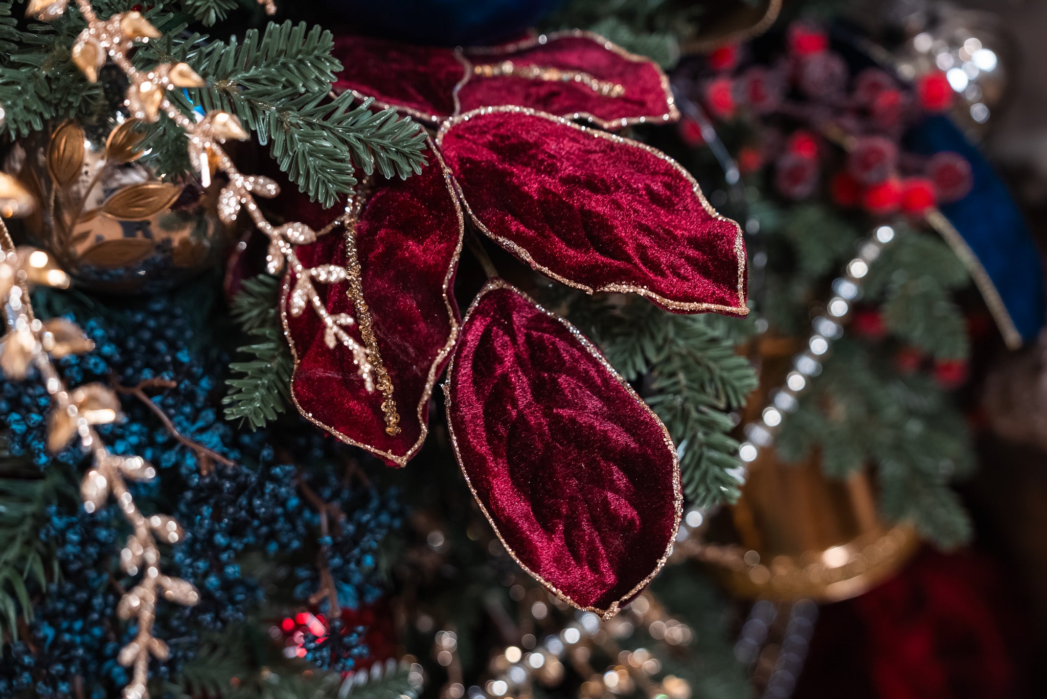 Rich, warm, and elegantly textured, our Burgundy Magnolia Velvet Leaf Spray brings a touch of luxury to your seasonal arrangements. Each leaf is crafted from plush velvet in a deep burgundy hue and delicately edged with fine gold detailing, adding dimension and sophistication. Whether tucked into a Christmas tree, woven into a garland, or placed in a vase, this spray captures timeless holiday elegance.