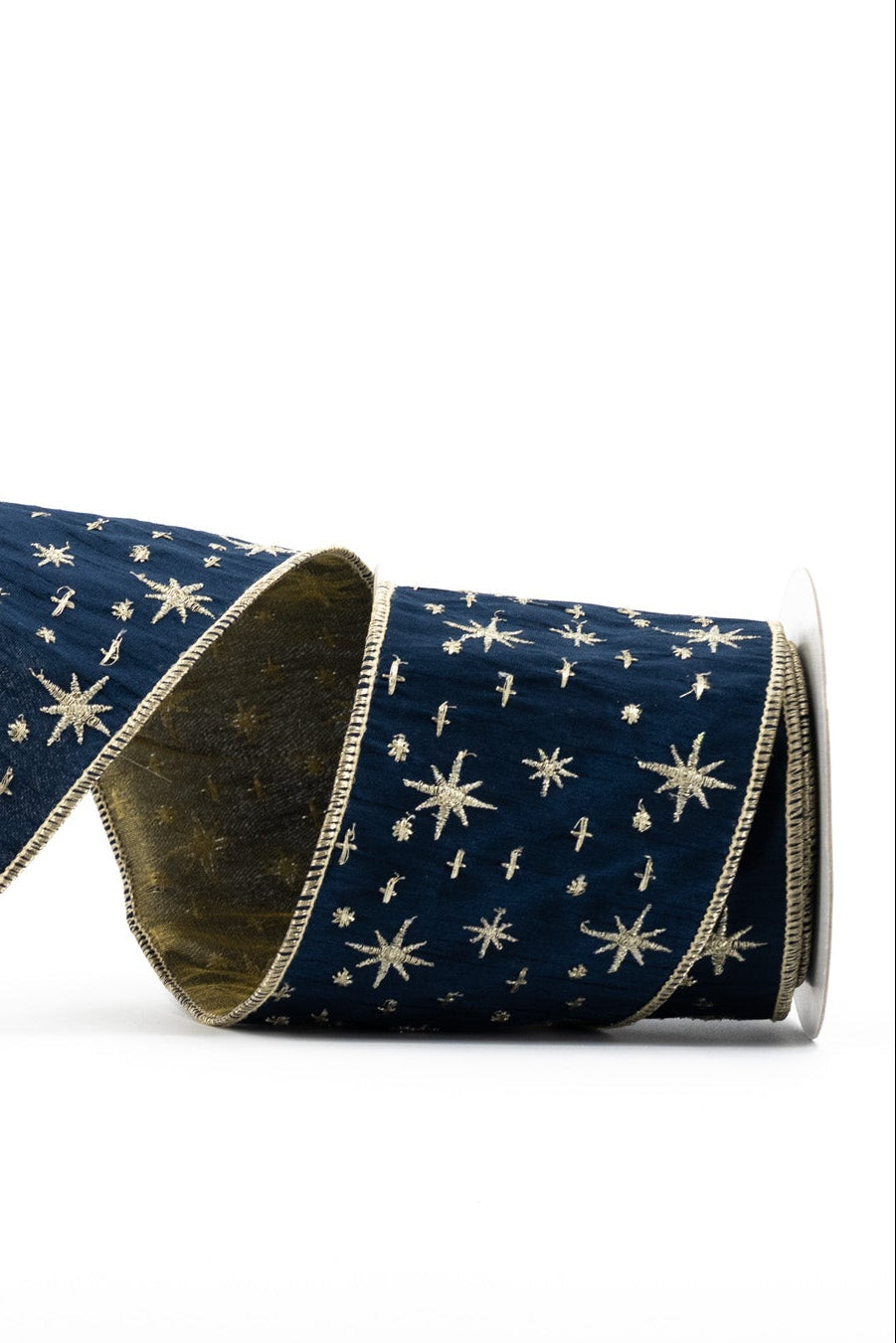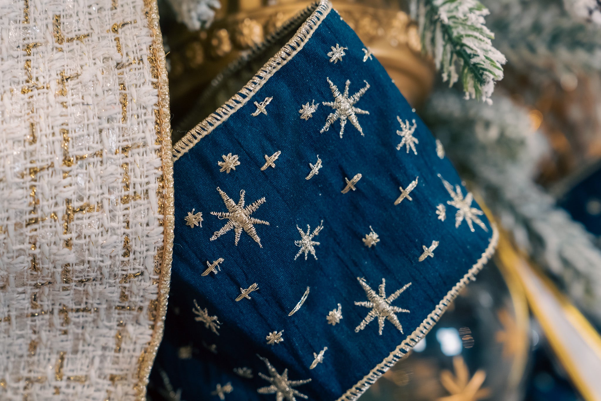 Bring a touch of celestial magic to your holiday décor with our Deep Blue Starry Night Ribbon. Rich midnight-blue velvet sets the stage for shimmering embroidered stars, creating a look that feels both enchanting and luxurious. Whether you’re dressing a tree, accenting garlands, or styling elegant bows, this ribbon adds a refined sparkle to any display.