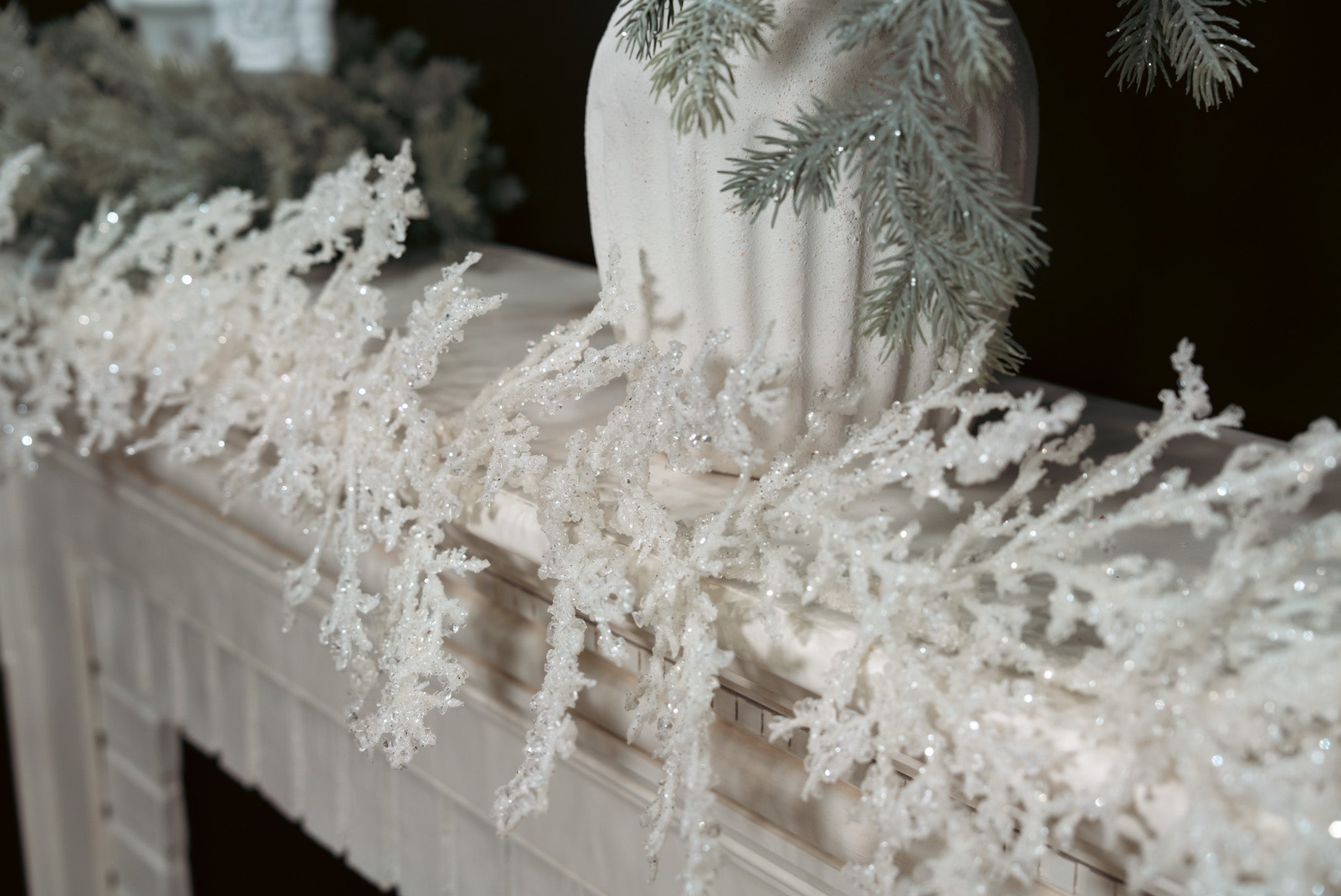 Bring a touch of winter’s sparkle indoors — the Glittered White Ice Garland adds the perfect blend of glamour and grace to any holiday setting.