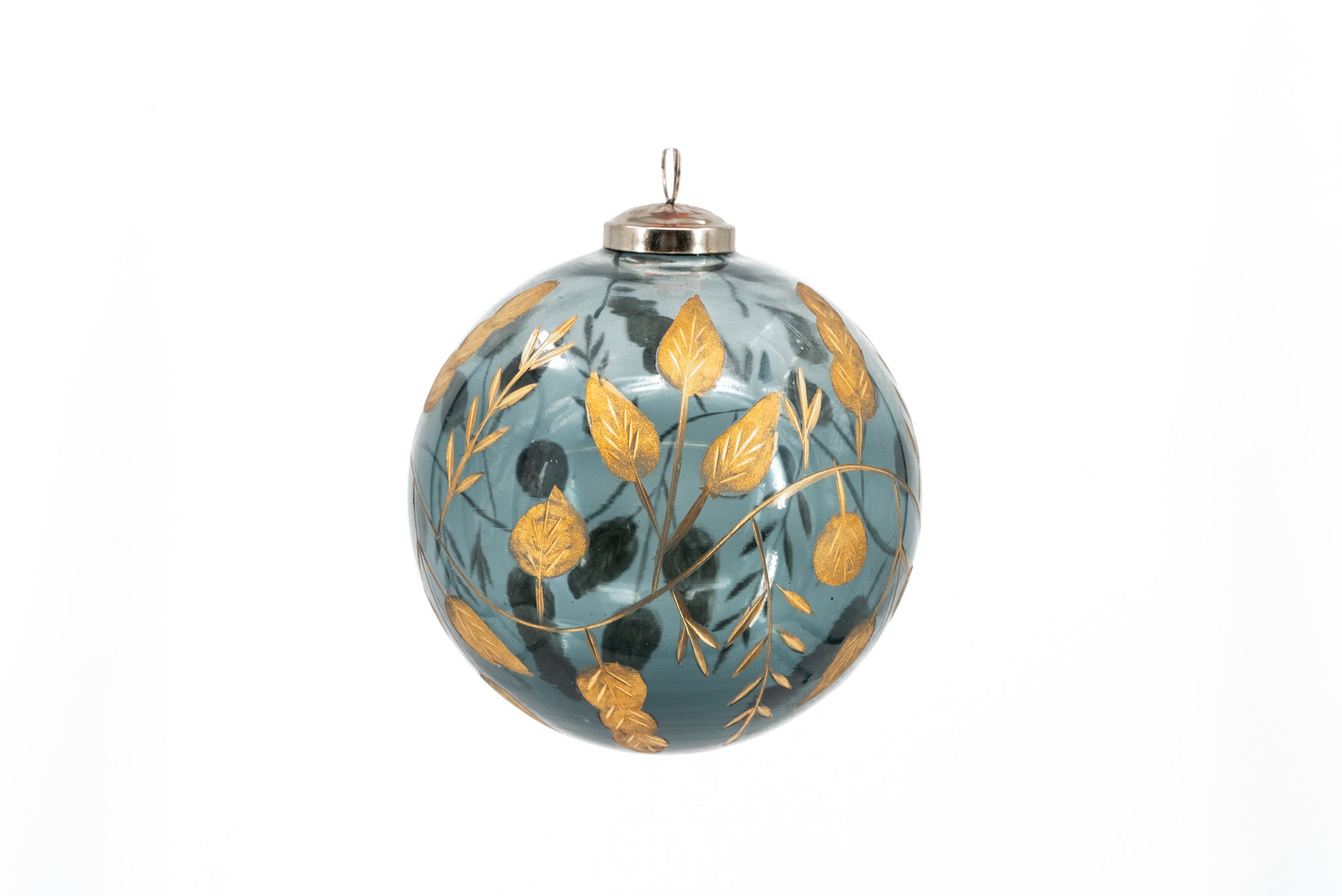 Elegant, refined, and beautifully detailed — this ornament brings a touch of artistry to your holiday décor. Its deep blue glass base is adorned with hand-etched golden leaves, creating a rich botanical design that glows effortlessly against the lights of your tree. Perfect for adding sophistication to classic, modern, or nature-inspired themes.