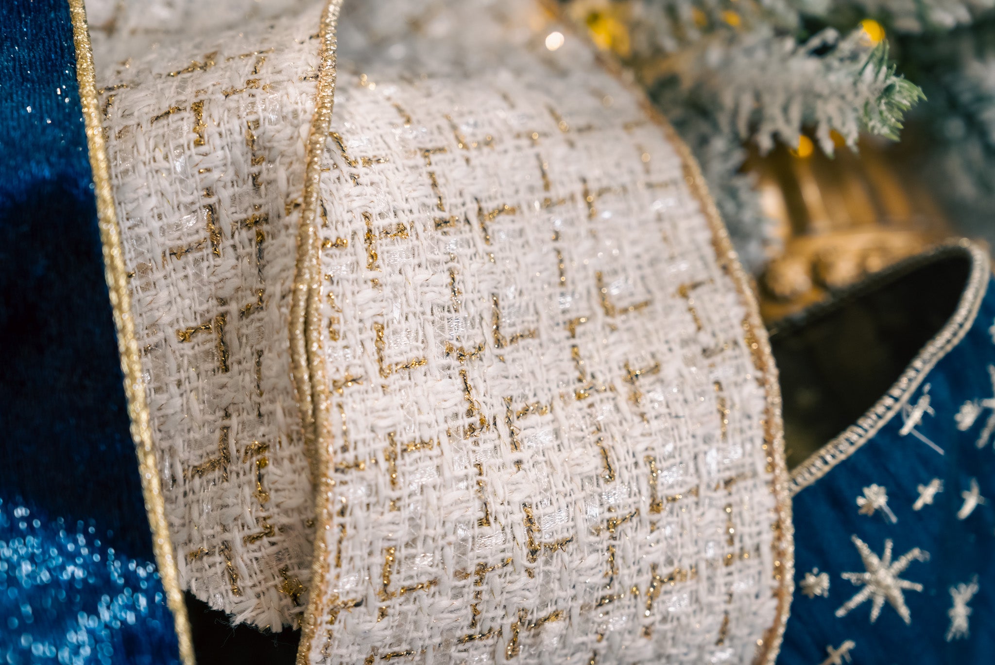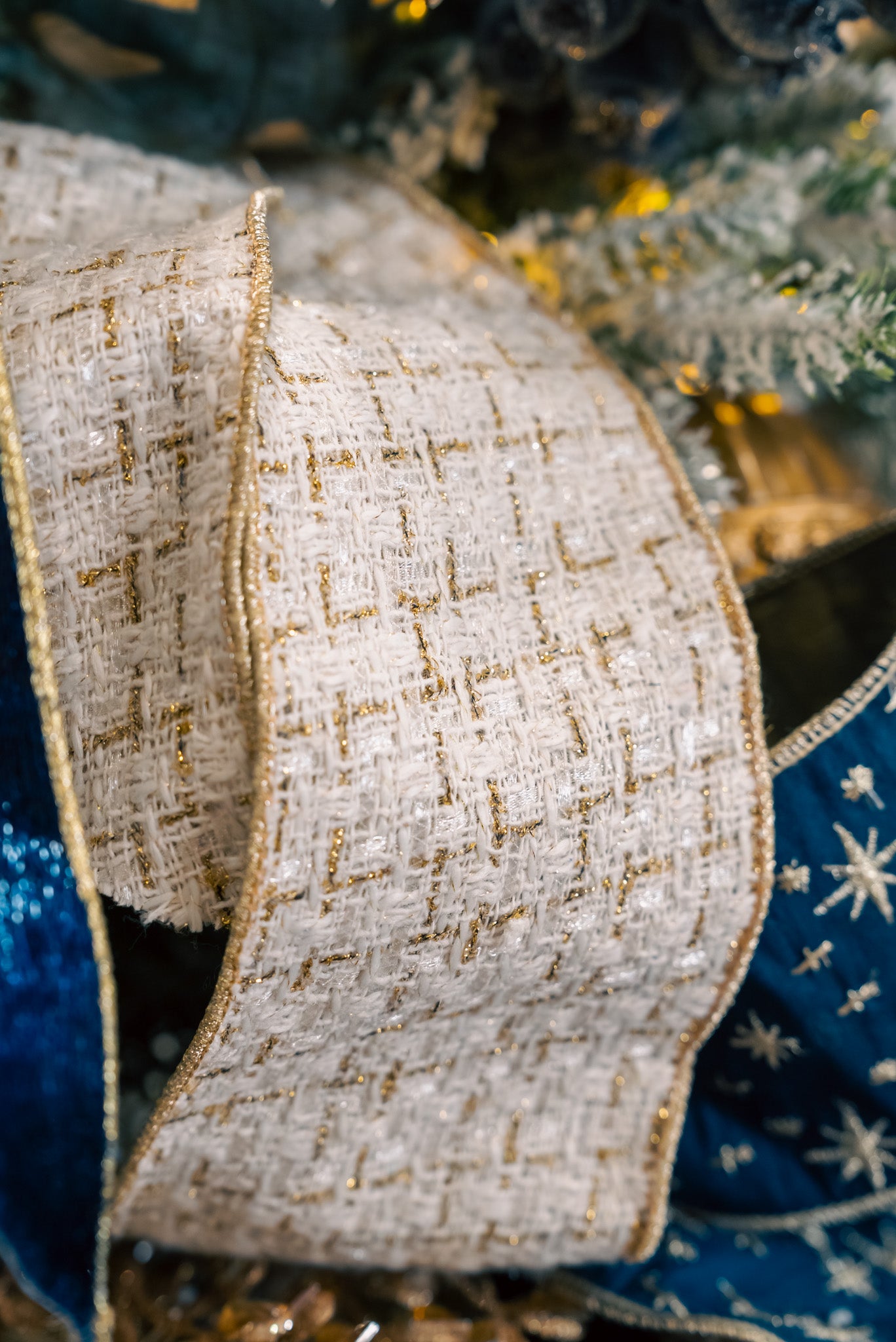 Elevate your holiday décor with the timeless charm of our Gold & White Tweed Ribbon. Featuring a beautifully woven tweed pattern accented with subtle gold threading, this ribbon brings warmth, texture, and sophistication to any design. Its structured body and wired edges make it perfect for creating full, elegant bows and stunning decorative details.