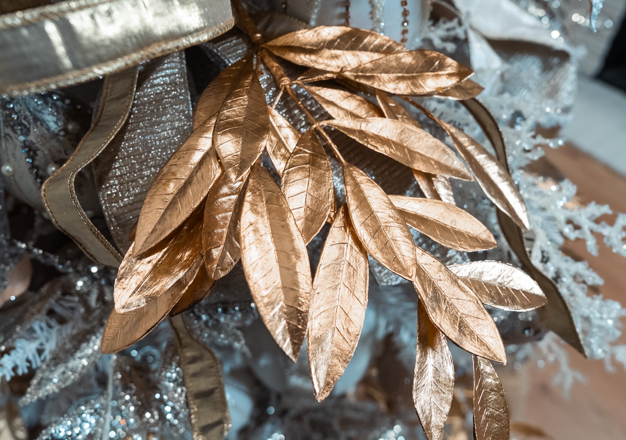 Bring a warm, refined glow to your holiday arrangements with our Golden Bay Leaf Spray. Featuring shimmering metallic leaves with a soft, brushed texture, this stem adds effortless luxury to trees, garlands, centerpieces, and floral displays. Its sculpted shape and rich gold finish make it a beautiful layering piece for both modern and traditional décor.