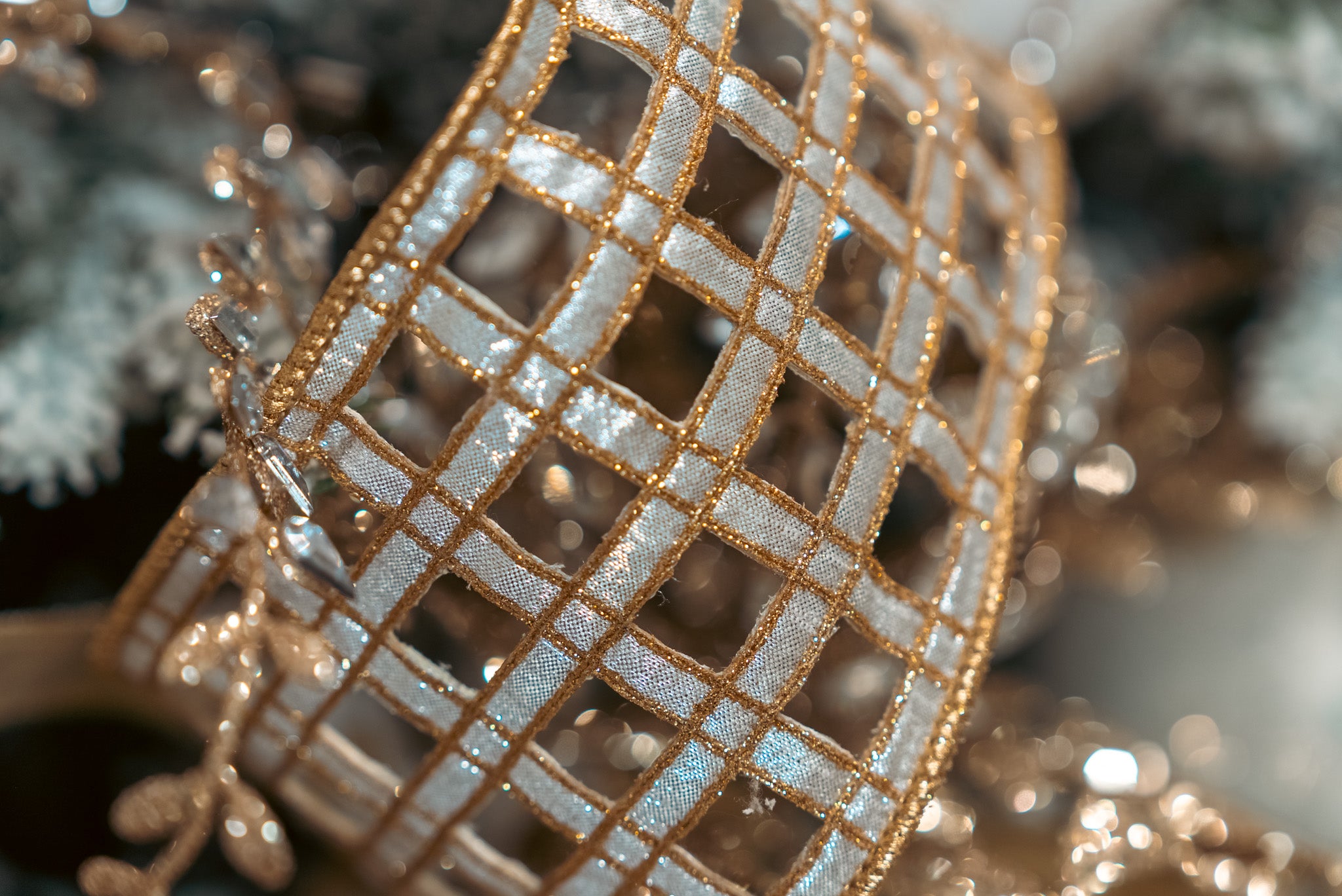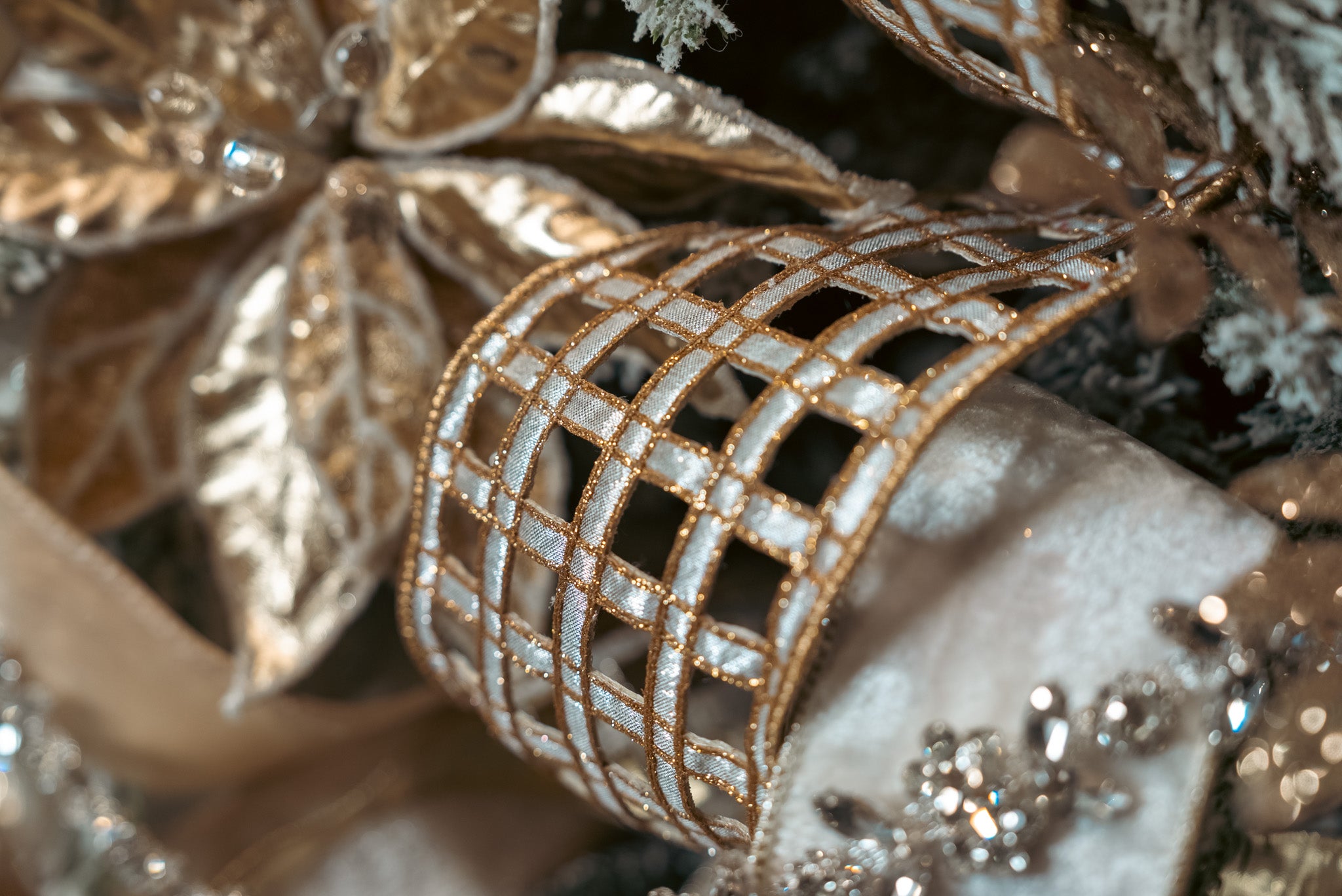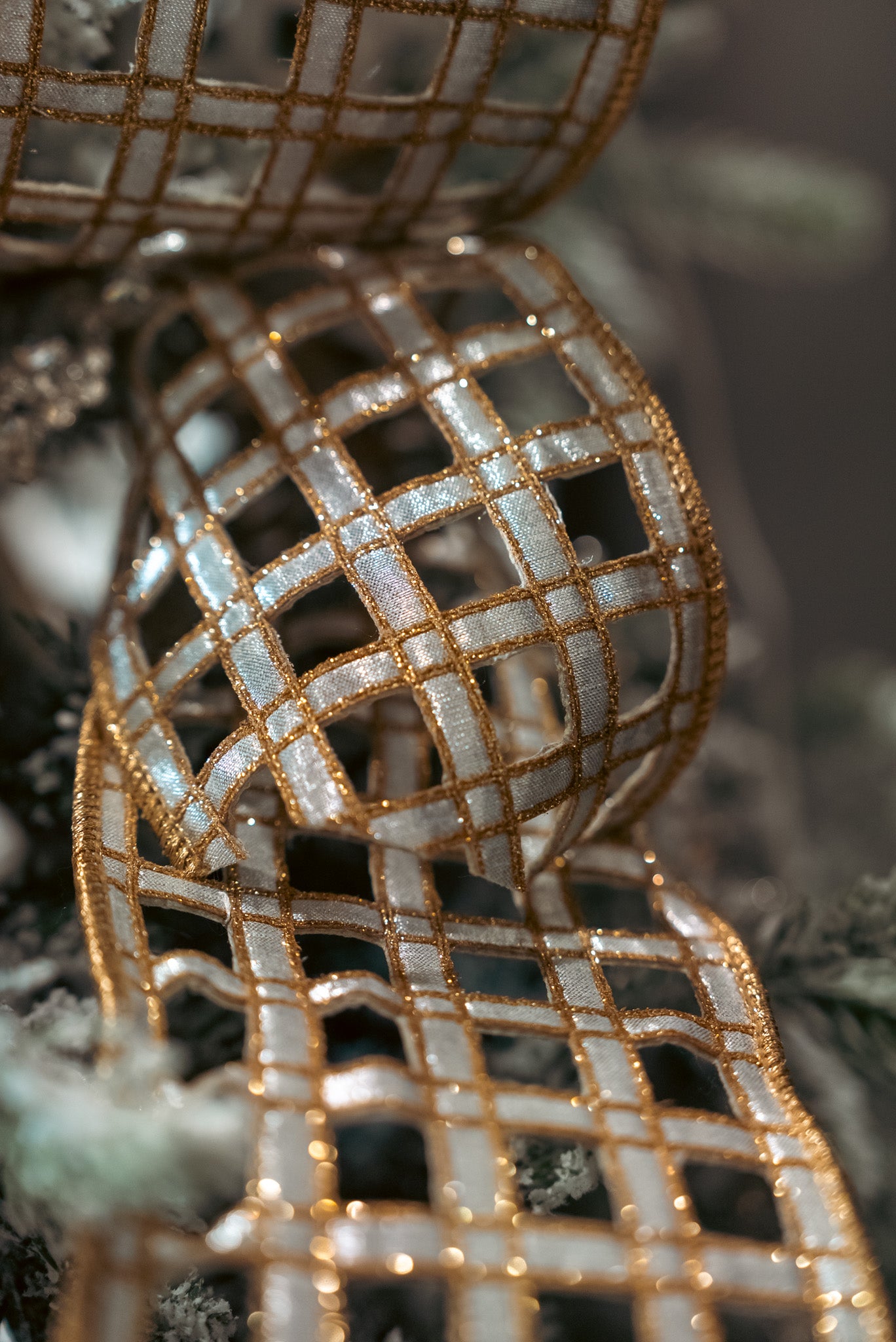 Sophisticated and versatile, the Golden Lattice Ribbon adds a touch of opulent charm to any holiday creation. Featuring a shimmering gold grid overlay on a soft metallic background, this wired ribbon is perfect for crafting dramatic bows, trimming trees, or accenting garlands and wreaths. Its structured design makes it easy to shape, holding its elegant form beautifully in every display.