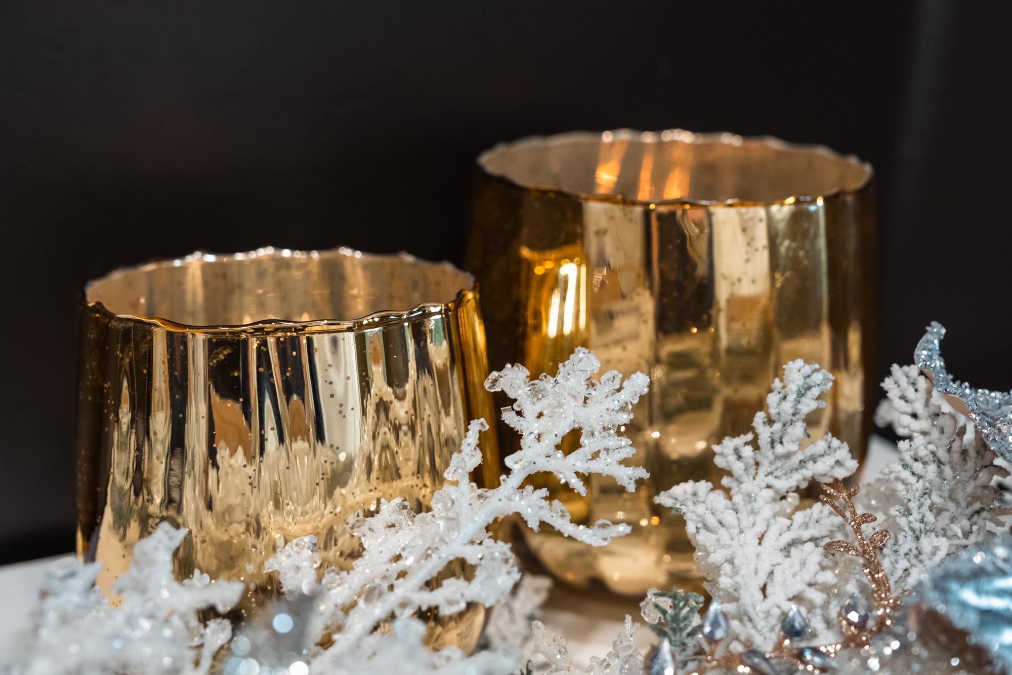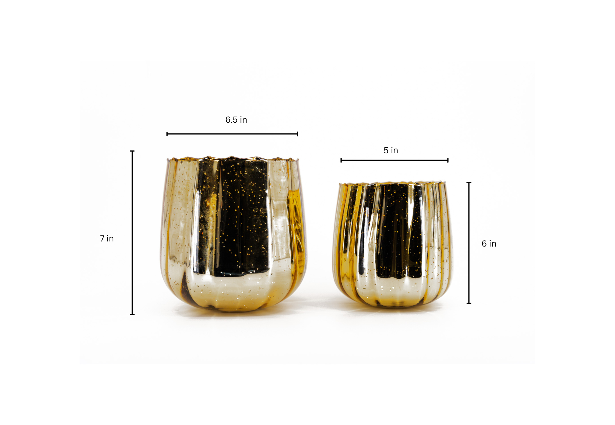 Elevate your holiday décor with this stunning set of Golden Mercury Glass Vases — a radiant pairing that brings warmth, shimmer, and timeless elegance to any space. Each piece features a ribbed silhouette with a reflective mercury-glass finish that sparkles beautifully in candlelight, making them perfect for florals, candles, or styling on shelves, mantels, and tablescapes.
