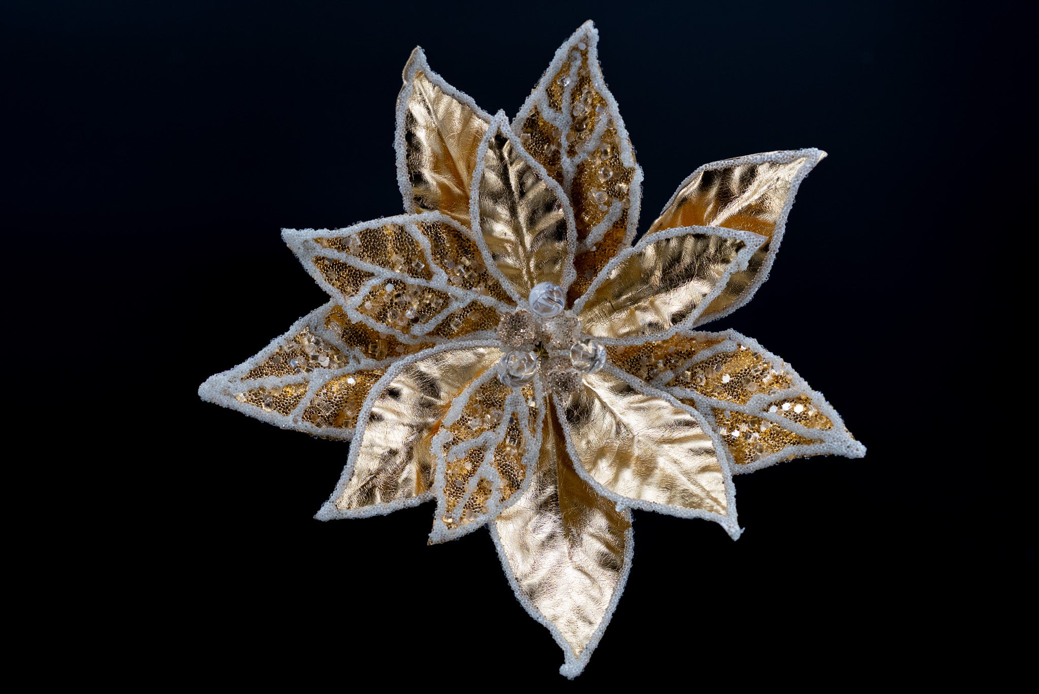 Radiant and timeless, the Golden Poinsettia Stem brings a touch of holiday grandeur to any arrangement. Its shimmering gold petals, trimmed with delicate beaded edges and sparkling sequins, reflect the light beautifully for a truly luxurious effect. Perfect for accenting trees, garlands, wreaths, or elegant centerpieces, this 20" stem adds a warm, golden glow to your seasonal décor.