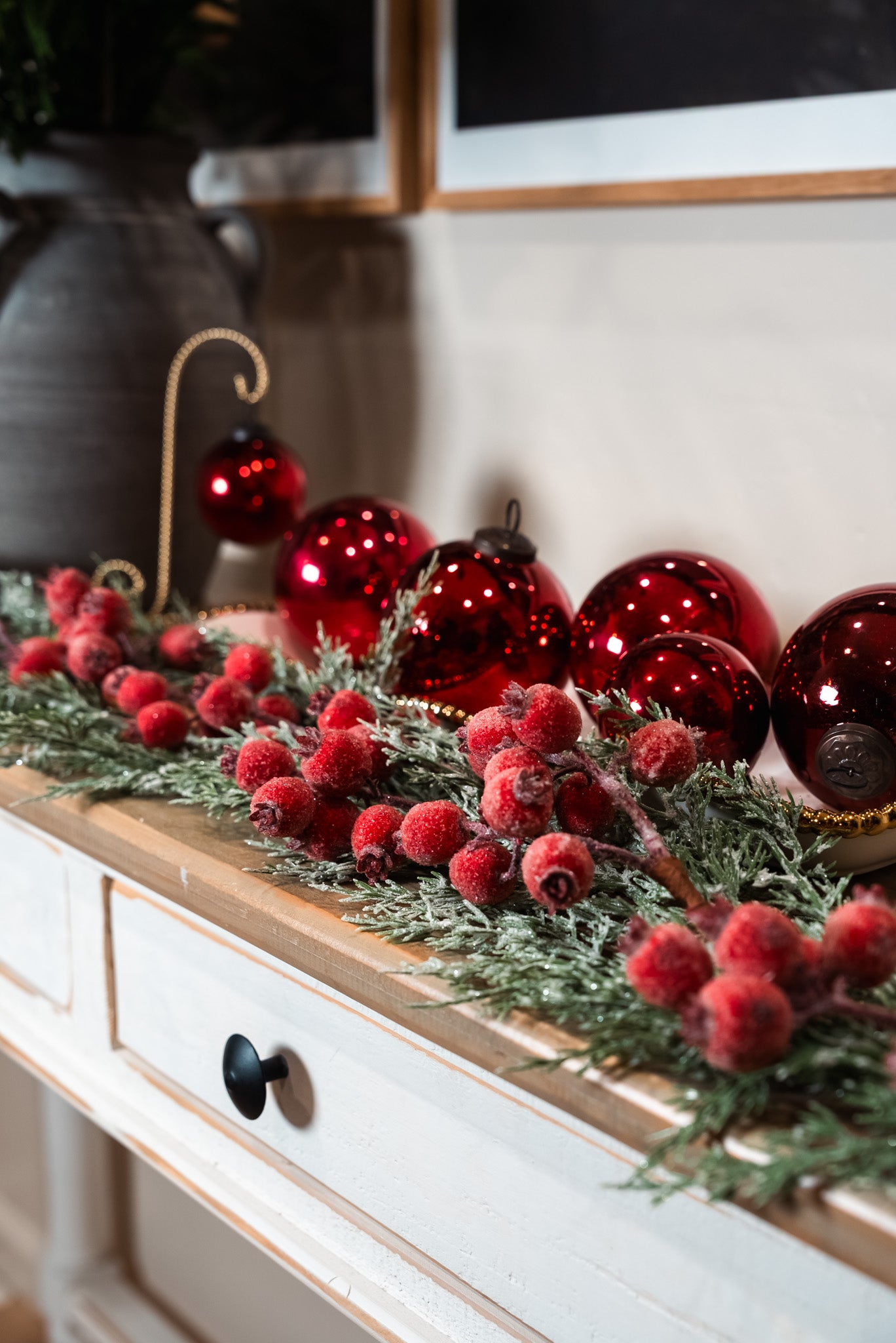 Bring the magic of winter to your home with our Iced Red Berry Garland. Lush green pine branches are beautifully accented with vibrant red berries, each delicately dusted with a frosted shimmer that captures the look of freshly fallen snow. This 6-foot garland adds a timeless, festive touch to mantels, staircases, or tablescapes, creating the perfect balance of elegance and holiday warmth.
