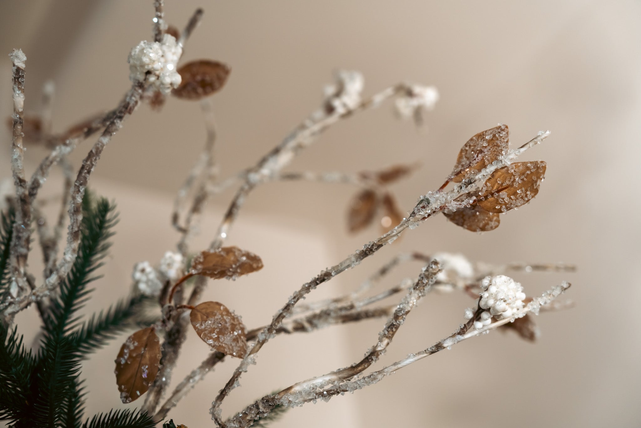 The Icy Twig Spray brings an elegant, frosted touch to your winter décor. Measuring 29 inches tall, this beautifully detailed stem features delicate brown leaves and clusters of white berries, each dusted with a shimmering icy finish. Its lifelike texture and subtle sparkle capture the stillness and beauty of a snowy morning.