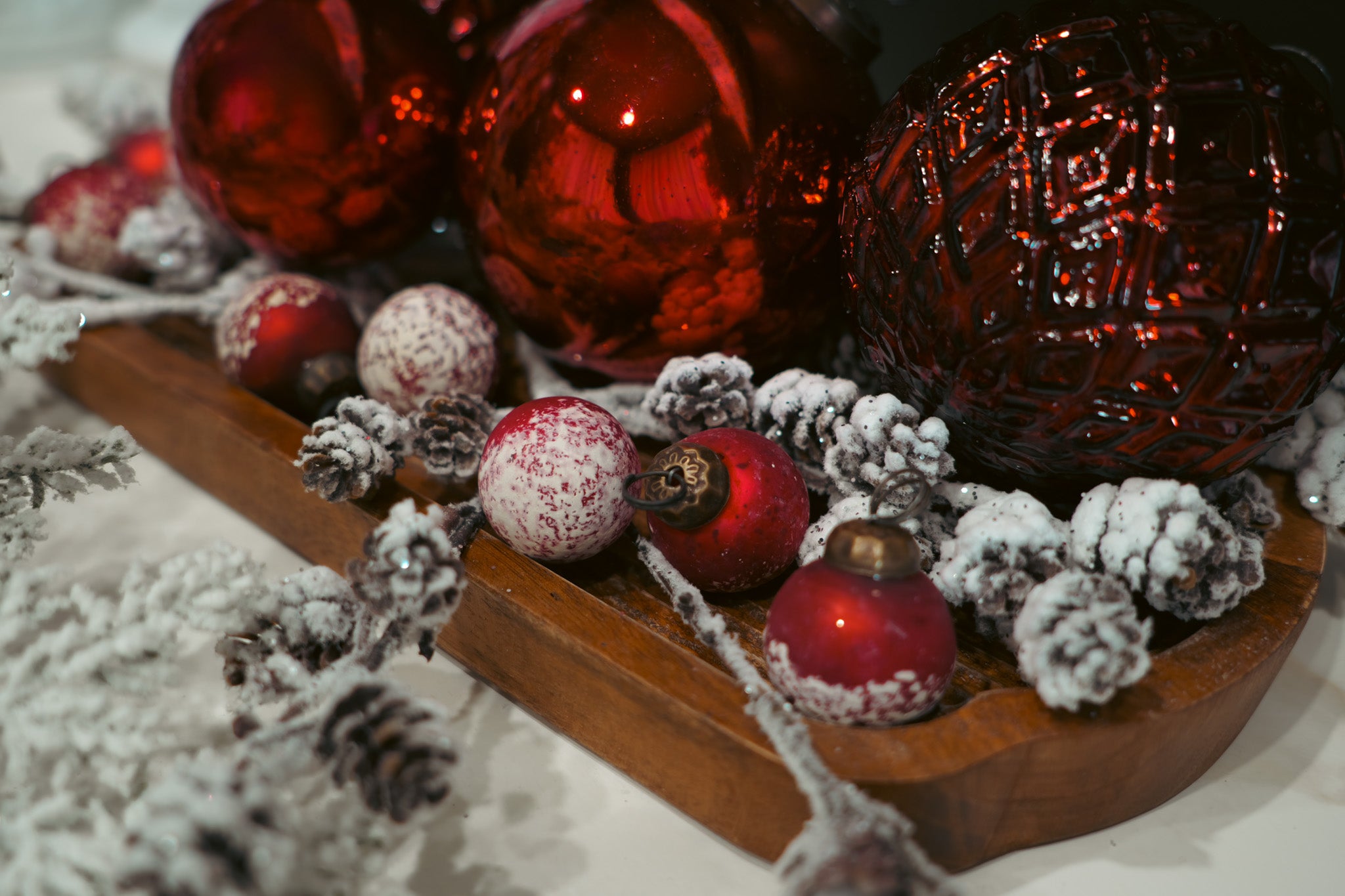The Mini Snowy Dark Red Ornaments deliver the nostalgic beauty of vintage Christmas in a perfectly petite size — small in scale, but big on holiday spirit.
