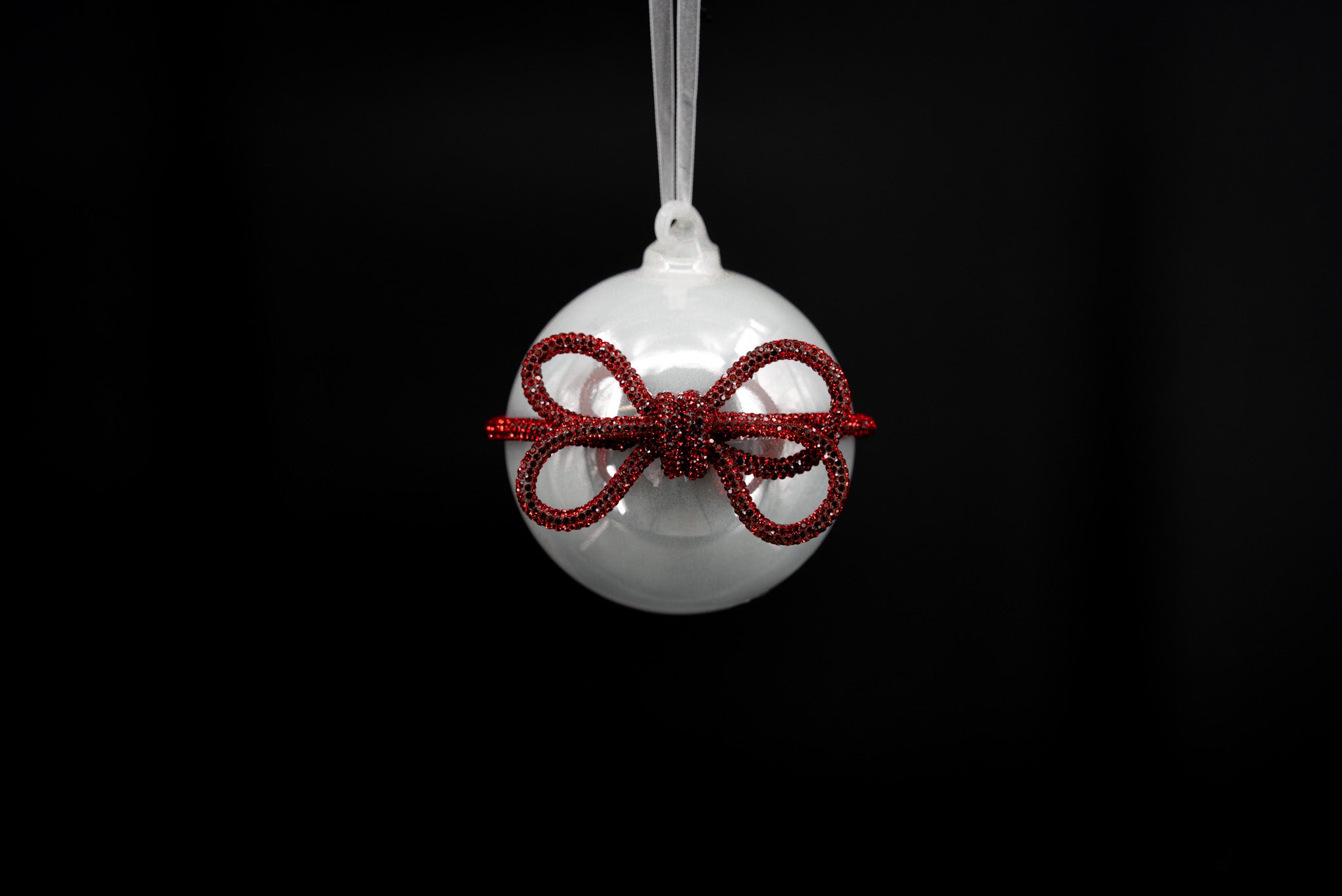 Finish: Glossy opaline white with red jeweled bow