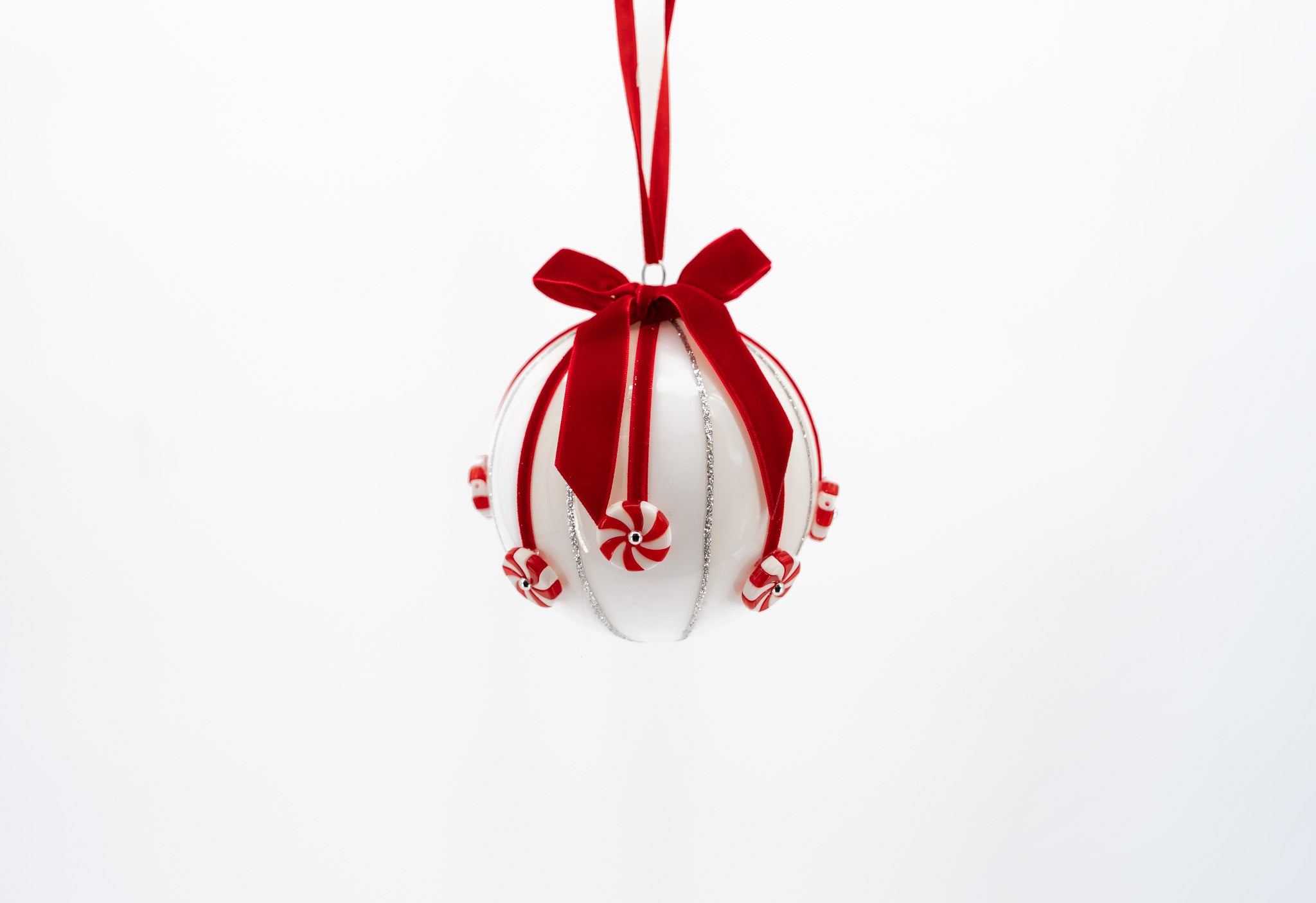 Its glossy white finish and bold red velvet stripes create a festive statement while maintaining a touch of refined charm. Perfect for adding personality to your tree, garlands, or holiday centerpieces, this piece brings sweetness and style to your seasonal décor.