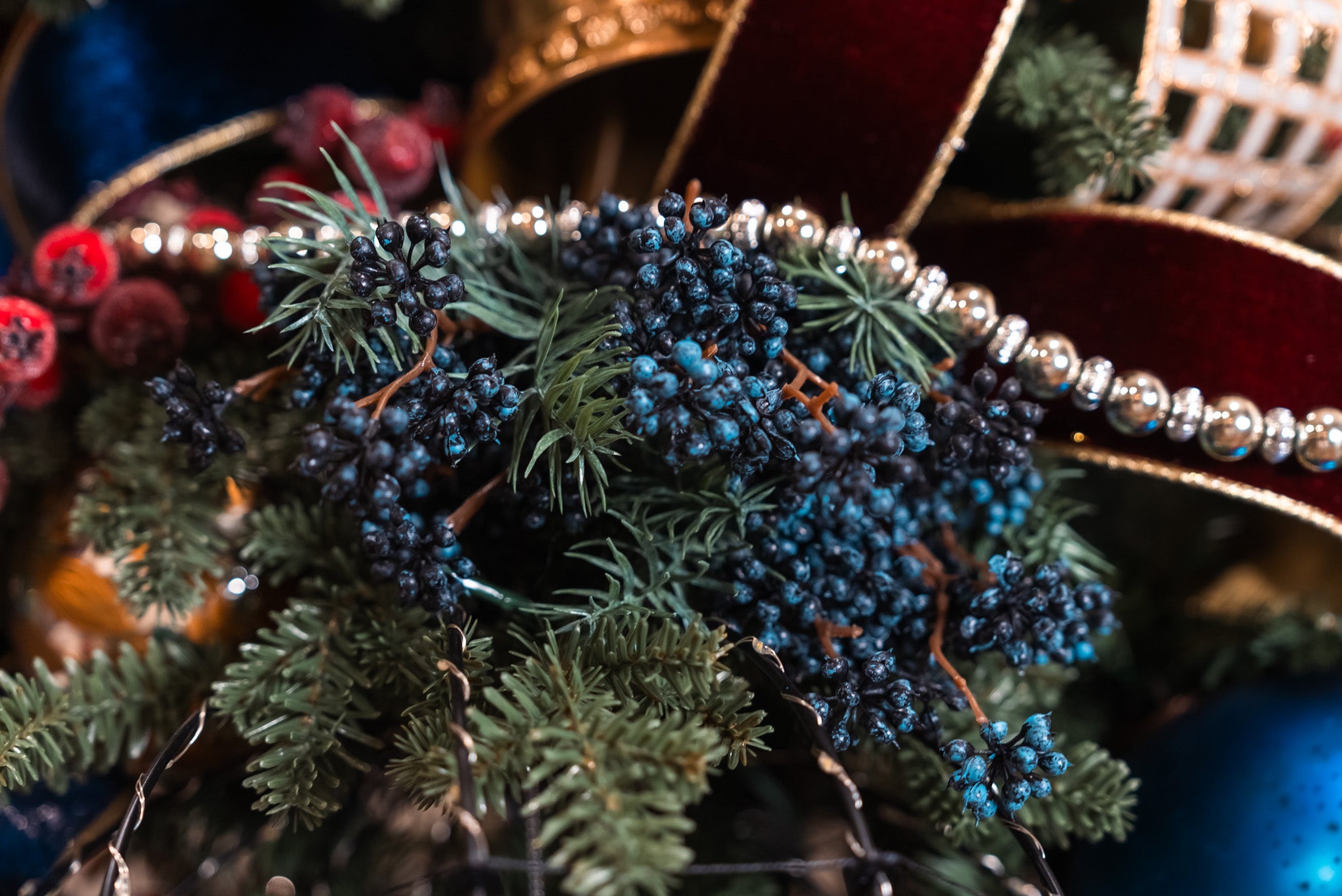 Features: Realistic pine greenery and navy berries