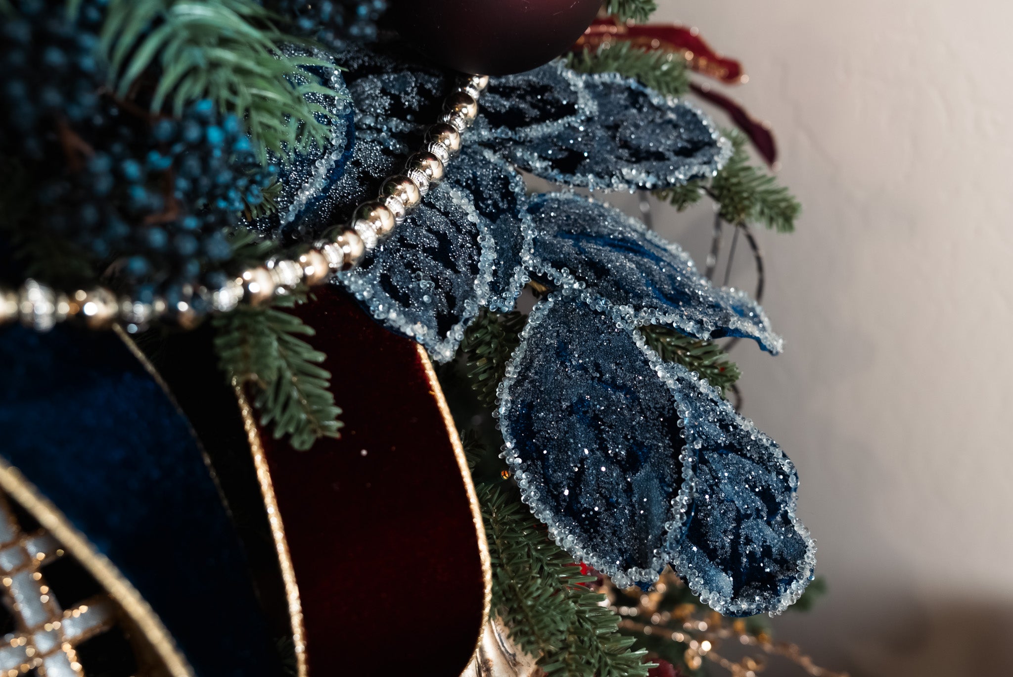 Bring a cool, enchanting touch to your holiday decor with our Royal Blue Leaf Spray. Each deep blue velvet leaf shimmers with a dusting of icy glitter, creating a look that feels both frosty and elegant. Perfect for winter arrangements, Christmas trees, or garlands, this spray adds a sophisticated sparkle reminiscent of a crisp, frozen morning.