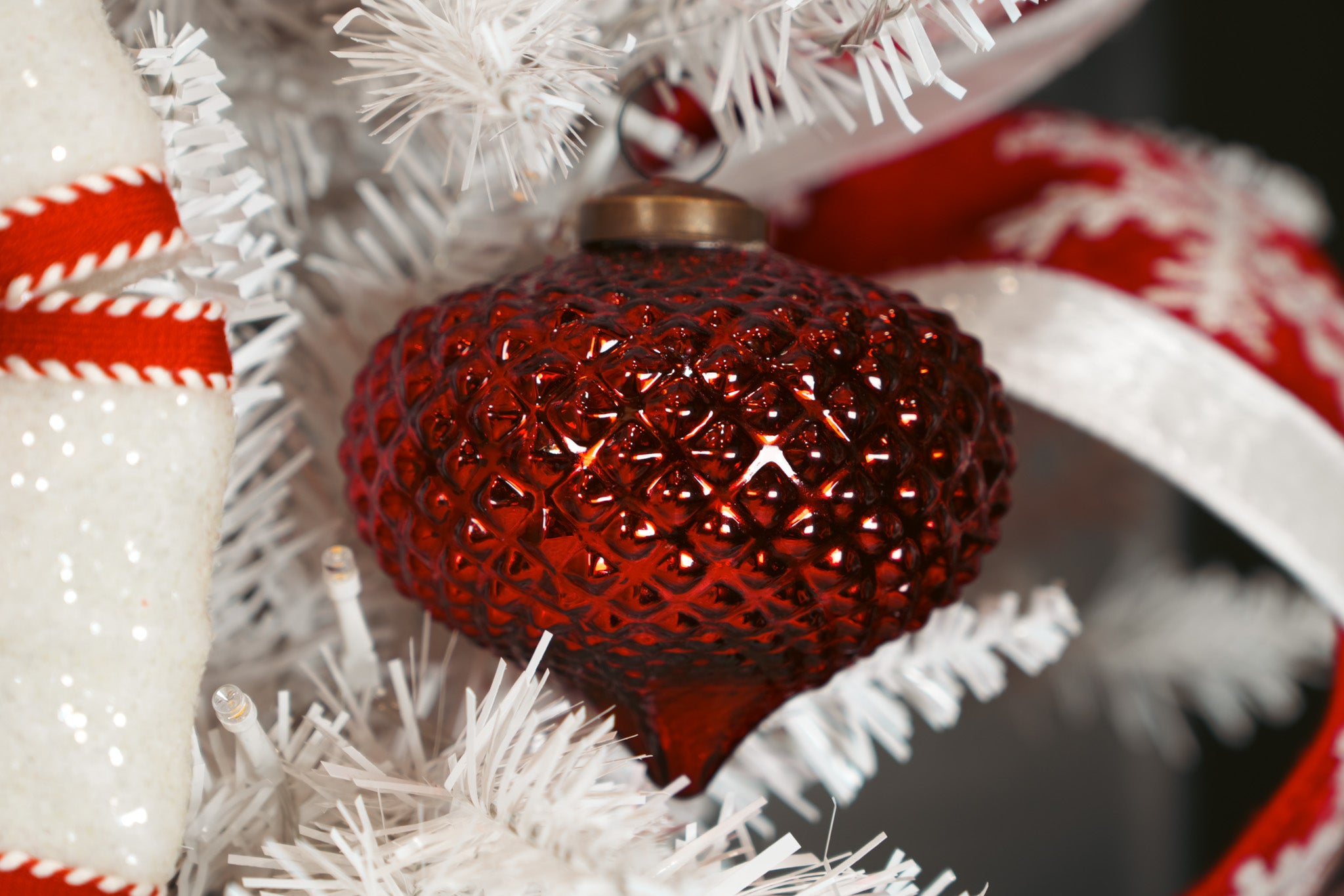 The Teardrop Hobnail Ruby Ornament adds a touch of classic glamour and festive warmth — a piece that sparkles with holiday nostalgia year after year.