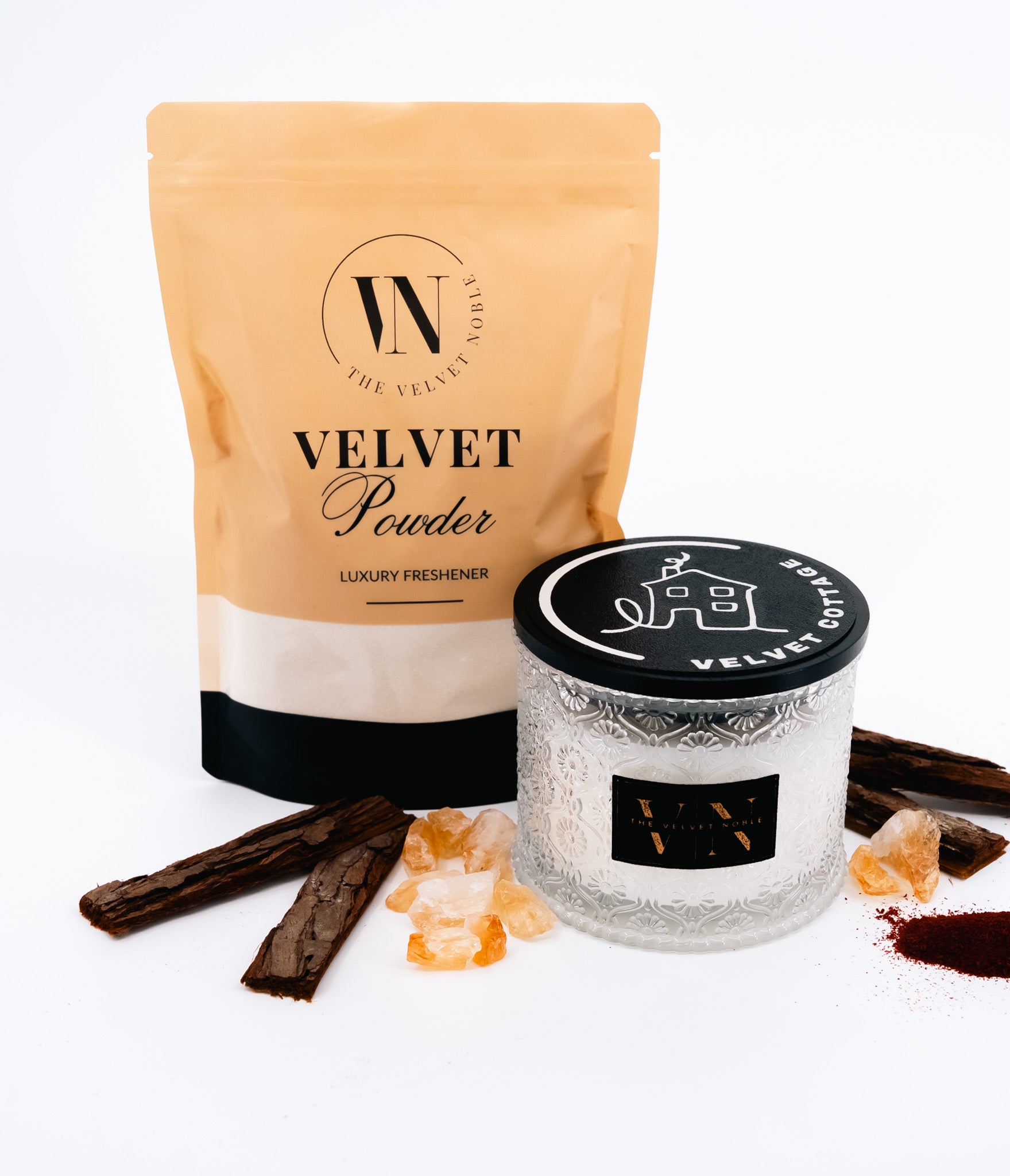 Transform your space into a sanctuary of comfort and style. This bundle pairs our signature hand-poured candle with our Velvet Powder, designed to refresh carpets and upholstery. Light the candle to set the mood, sprinkle the powder to revive your home, and enjoy a fragrance that lingers beautifully.