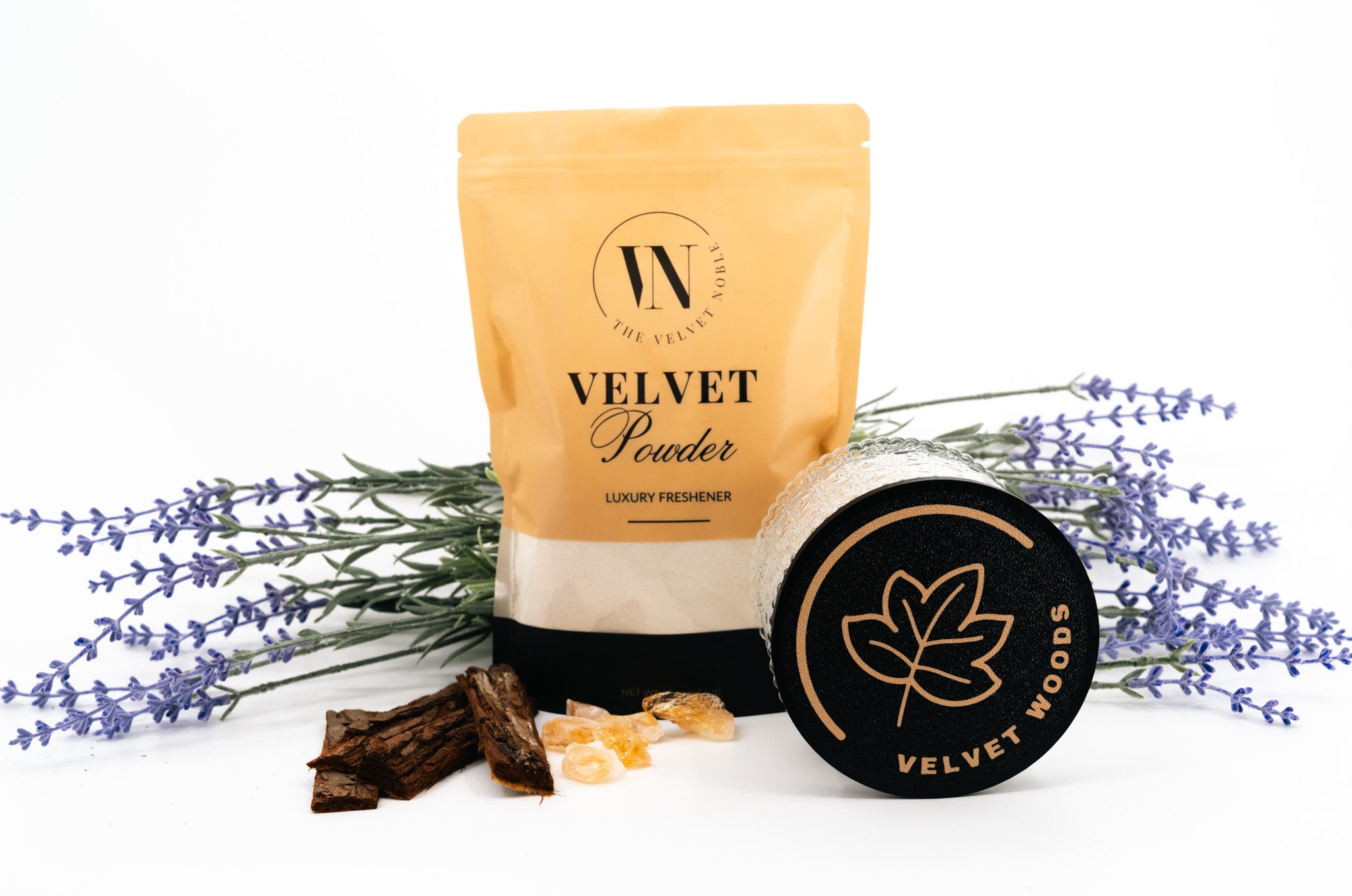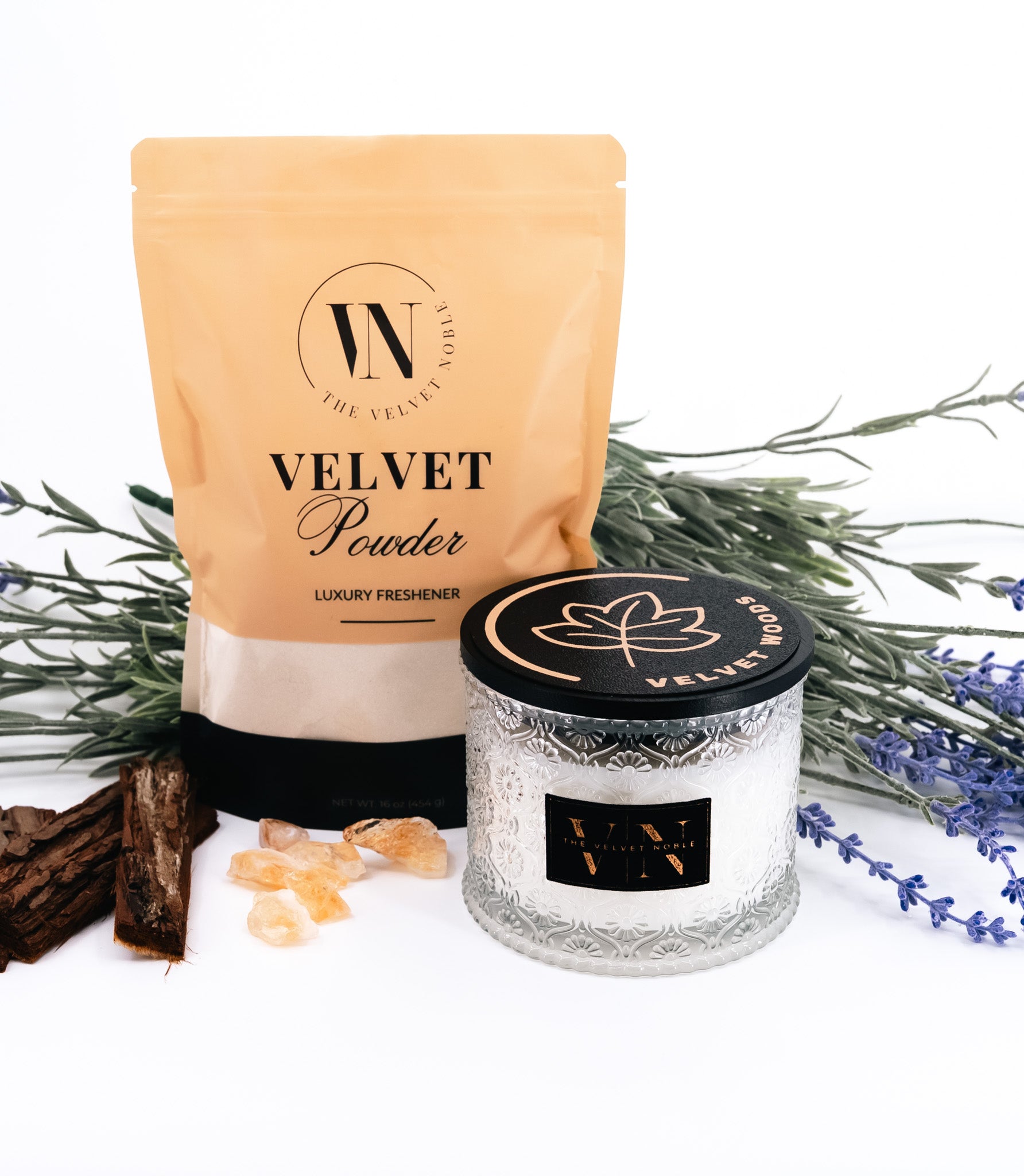 Transform your space into a sanctuary of comfort and style. This bundle pairs our signature hand-poured candle with our Velvet Powder, designed to refresh carpets and upholstery. Light the candle to set the mood, sprinkle the powder to revive your home, and enjoy a fragrance that lingers beautifully from floor to flame.
