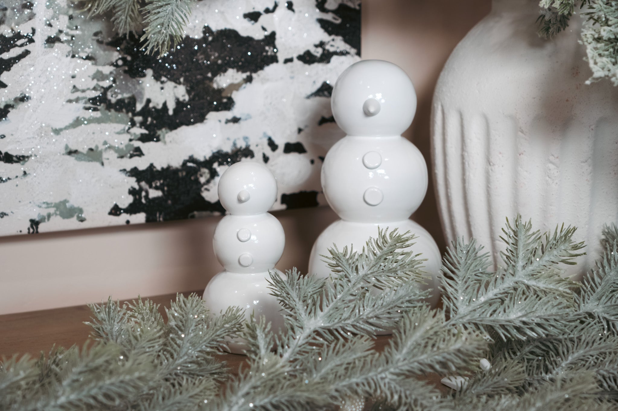 Each snowman is crafted from durable ceramic and finished in a soft white glaze that reflects light beautifully, creating a calm, wintry glow. Perfect for mantels, shelves, or as part of a centerpiece, they blend effortlessly with any holiday décor style—from cozy farmhouse to elegant modern.